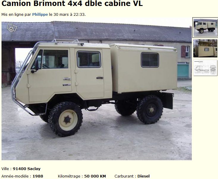La cabine est neuve, la cellule aménagée sommairement, conso donnéee pour 14l/100 (moteur indeor peugeot TD, double blocage de différentiel pont avant et arrière, vitesse longue et courte.