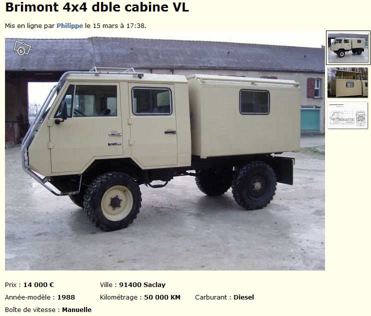 Suite à report de prjet, je vends mon Brimont double cabine VL. La cabine est neuve, la cellule aménagée sommairement, conso donnéee pour 14l/100 (moteur indeor peugeot TD)