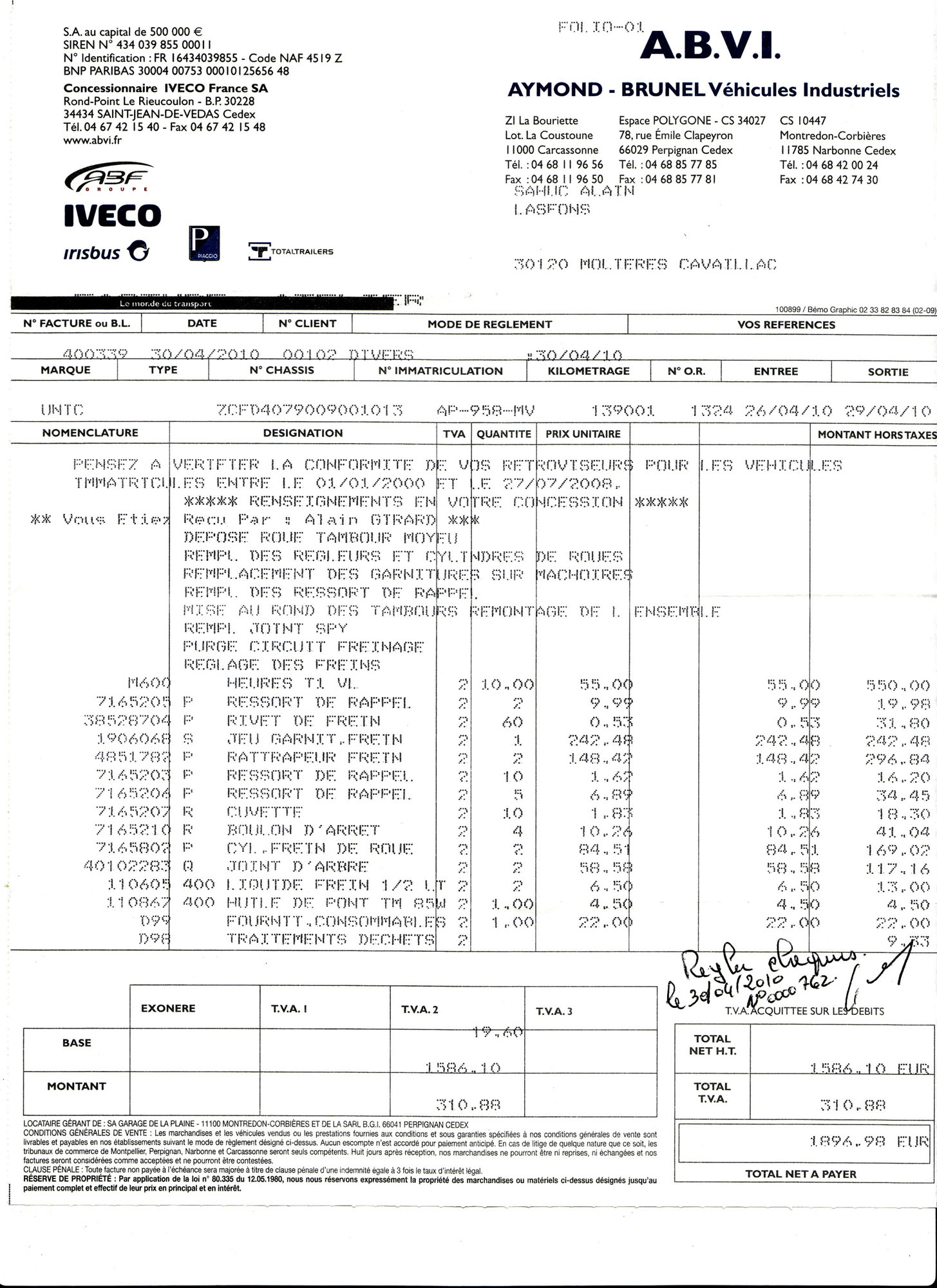 Pour info : la facture d’ivéco Bézier pour les freins