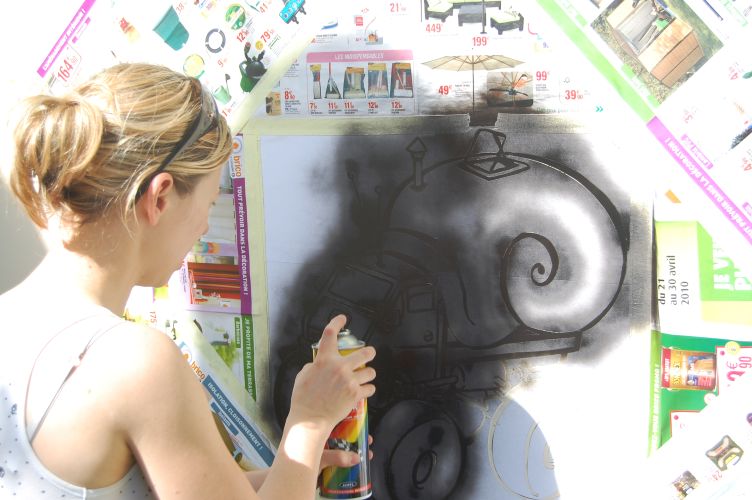 Une fois collé je m'arme d'un petit cutter, de patience et je découpe toutes les parties noires, ce qui donne cela : Je bombe après avoir protégé les contours avec les pubs emplissant la boite aux lettres. Je laisse sécher, au soleil ça va vite. Je décolle délicatement le papier. Je fais des retouches avec la peinture du fond. Je dessine ma typo et la masque au scotch. Je répète bombage, séchage, retouchage et v'là un finalizage ! Si OB1KnoB le permet je vous mets le fichier pdf en pièce jointe pour ceux et celles désireux de reproduire ce merveilleux atelier