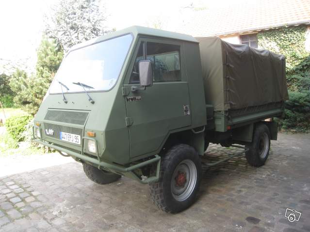 Véhicule complet, roulant toutes distance. Année 01.04.1991, 56800km, moteur Peugeot XD3T, 95 cv, turbo diésel, 8 cv fiscaux, 2 places (sièges suspendus), 5t100, poids à vide 2t800( permis pl), carte grise plateau baché et fourgon (dim plateau : 3m05 x1m97). Passage mines ok rapport de conformité ok, boite vitesses 5 grandes, 5 petites, blocage arrière et inter-pont pneumatiques 10,5x20 ou 15,5x55R18.Réservoir 95L