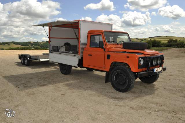 vds land rover 130 defender td5 an 2005 49000 kms , avec benne aluminium pick up , caisse alu amovible ouvrante sur les deux cotés, sieges avant td4 plus confortable , double amortisseurs ar , ressorts renforcé , prepa 165 cv, 50 litres d'eau , 3 jerricans de 20 litres avec supports a droite du land , jantes acier large, pneus michelin O/R renforcé (5) , galerie alu sur le toit , treuil warn 4 tonnes avec relai etanche et corde plasma , pare choc renforcé ,