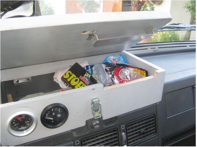 J'ai viré le couvercle de la boite à gant supérieure et j'ai fait une réhausse en contre plaqué avec un couvercle dans lequelle est encastrée la support tournant de l'ordi