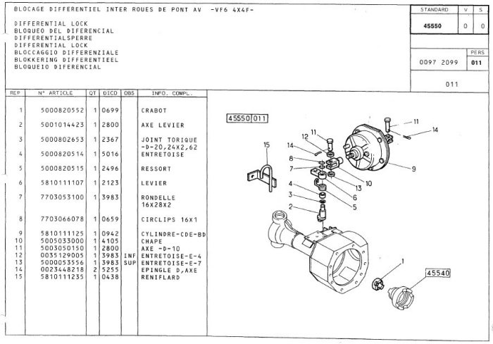Pour le fonctionnement de l'avant c'est tout simple : le poumon (9)fait sortir le vérin qui pousse l'axe (6/2) qui tourne sur lui même et fait glisser la bague (1) sur le demi-arbre de roue droit et l'enclenche (la bague) dans les dents de la pièce [45540] qui est solidaire de la couronne du couple conique dans laquelle est logé l'autre demi-arbre de roue, les rendant ainsi tous les deux solidaires = plus de différentiel.