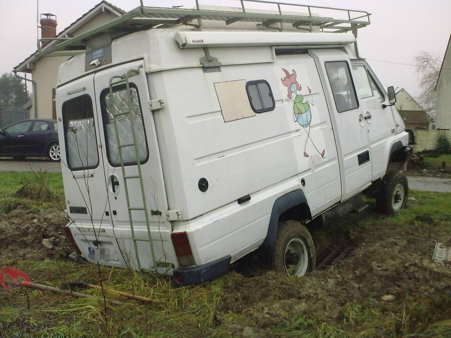 J'ai dégagé les roues et le dessous du pont. Je voulait lever les roues pour mettre les plaques. Mais j'ai trouvé plus simple, tirer le B avec un bon vieux Cherokee 4litres. Trois, quatre coups de sangle bien viriles et le B est sorti.