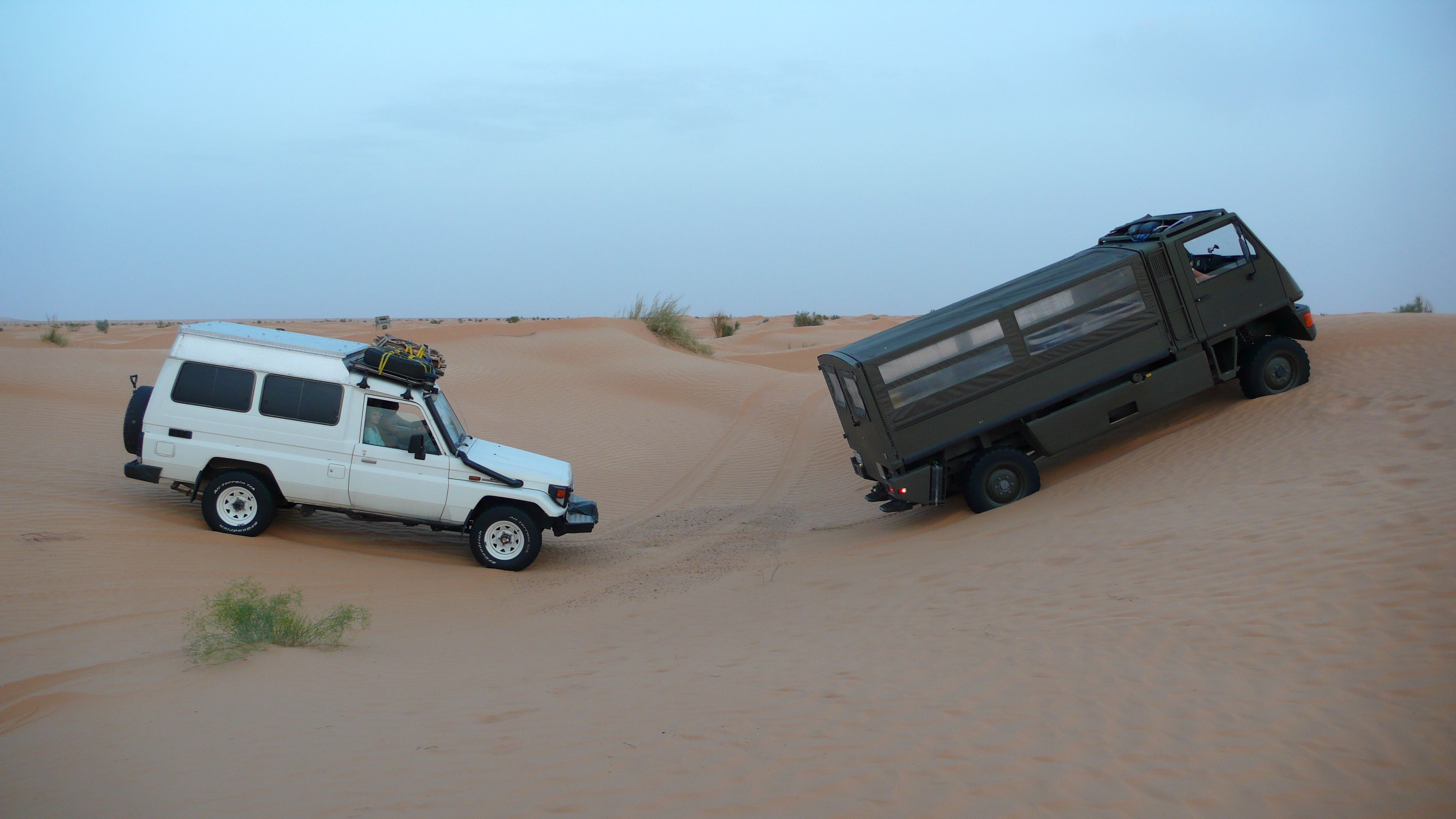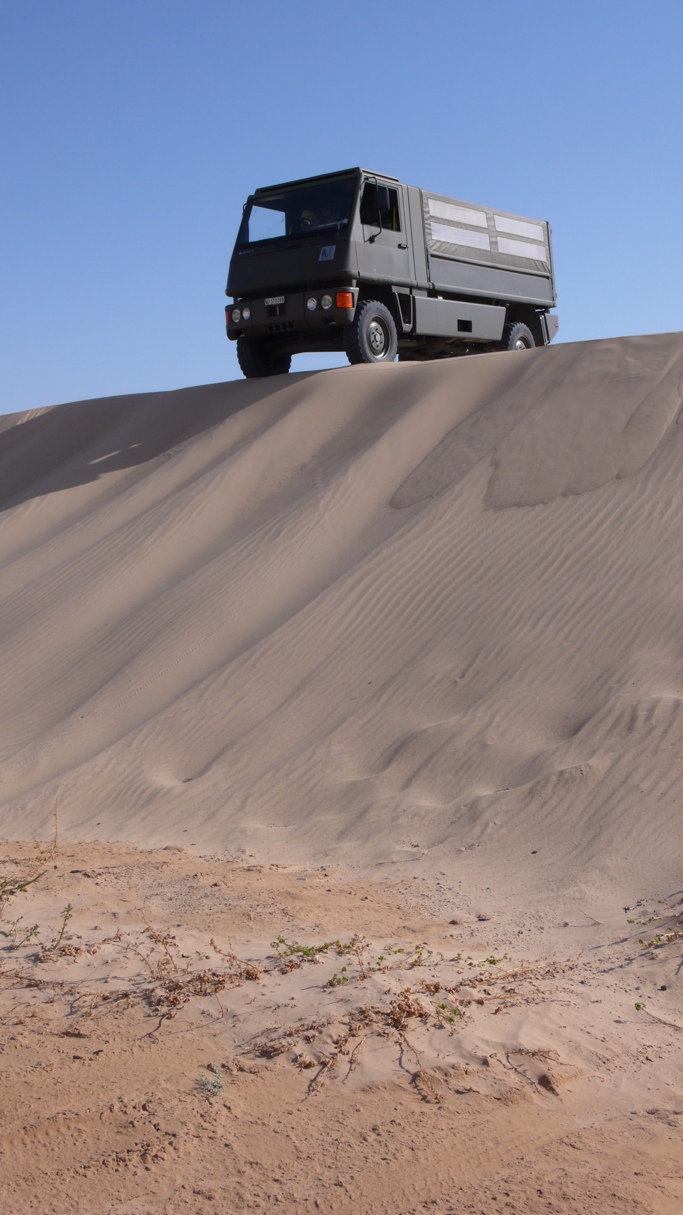 Mais ça ma permis de confirmer très vite les capacités démentielles de ce véhicule sur piste, dans sable ou en franchissement. De comprendre très vite aussi la limite de ce genre d'engin avec des pneus à gros crampon sur l'autoroute.... De découvrir les joies du voyage dans un camion militaire bâché à la cabine non-insonorisée, de découvrir une culasse fendue (arg), ce qui ne m'a pas empêché de mettre une grosse raclée dans le sable aux deux proprios de Toyota bien équipés qui m'accompagnaient (après 1500km d'autoroute et de railleries... mmh c'est bon), de finir par ouvrir la route pour un proprio de pinz 6x6 qui ne voulait pas d'un Duro dans les dunes, et finalement de rentrer en Suisse, après 4000km de bourlingue, et des culasses toujours plus fendues. :-S