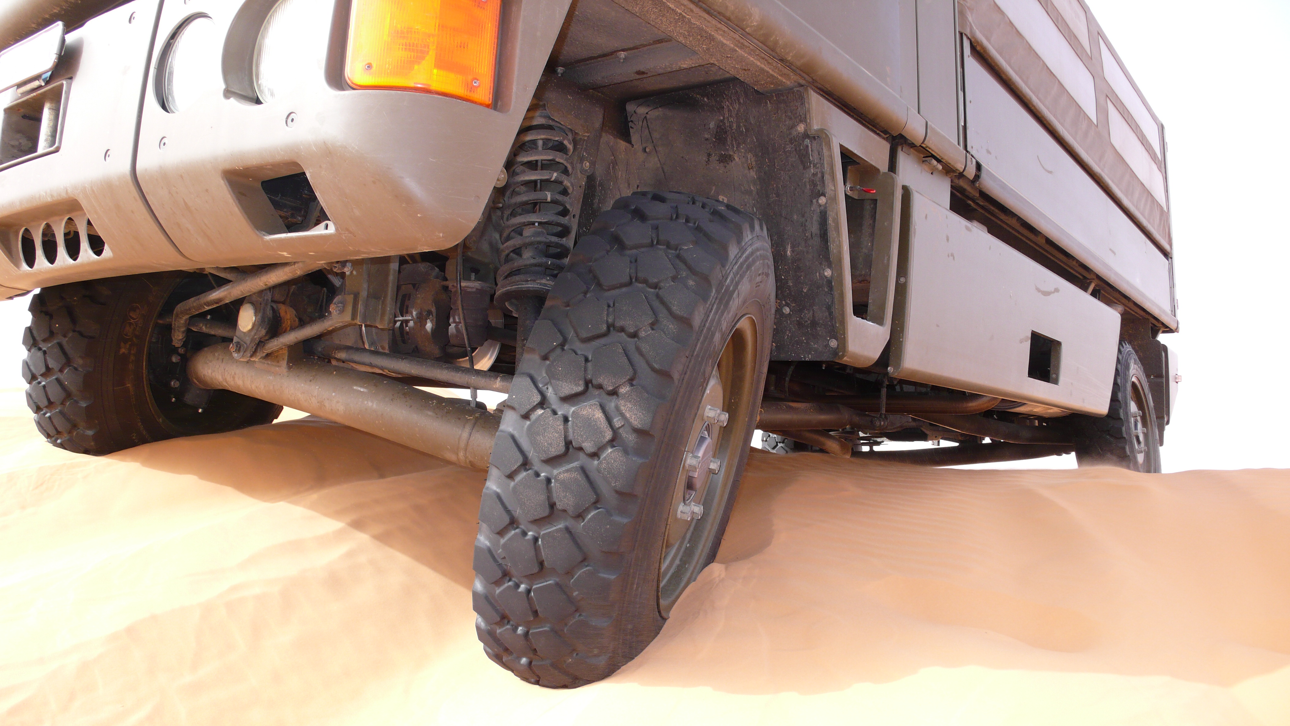 C'est un camion vraiment intéressant sur piste et dans le terrain avec des limites bien sur en franchissement pur. Car on est bien d'accord, rien ne vaut des blocages à 100%. Mais l'idée des torsen qui donnent le couple à la roue qui tourne le moins vite et le fort débattement, allié au système vraiment révolutionnaire de l'anti-rouli, y'a de quoi aller loin.