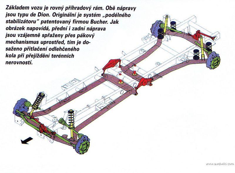 De plus, outre son grand débattement, les torsen, les ponts de Dion à portiques et les parallélogrammes de watt, sa force réside dans le système unique et développé par Bucher de barre anti-roulis.