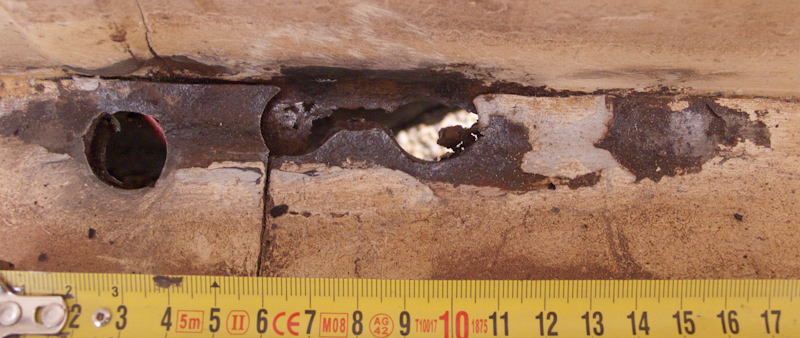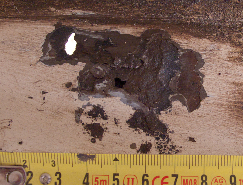 Trou 3 débouche dehors, au départ juste une cloque sous la peinture, mais avec la brosse métallique sur la perceuse....