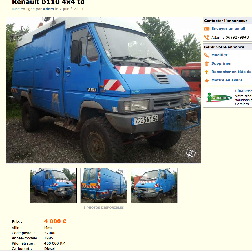 Yoda j'ai appeler l’annonce le 13 avril, Renault b110 turbo 4X4,sur leboncoin ,il n'était pas encore vendu,mais comme je n'ai pas le PL j'ai laisser tomber,après une nuit de réflextion,je me suis dit que peut-être on peut le déclasser en VL, alors j'ai rappeler,trop tard vendu,le gars me dit qu'il en rentre un autre en fin de semaine,génial je le rappelle le jour venu,niquel il à bien rentrer un b11O 4X4,avec moins de km(100000km) en aussi bon état.J'ai attendu 10 jours pour avoir des photos,est la surprise je voie le même b110 que sur l'annonce du mois avril,les stikers" travaux sous tension" en moins et le porte échelle en moins aussi, je fait défiler les photos quand je tombe sur une le B de face ou on voit la plaque d'immat est la à mon grand désarroi,c'est la même plaque que sur l'ancienne annonce ,déssus tout s'écroule,j'ai rompu le contact.