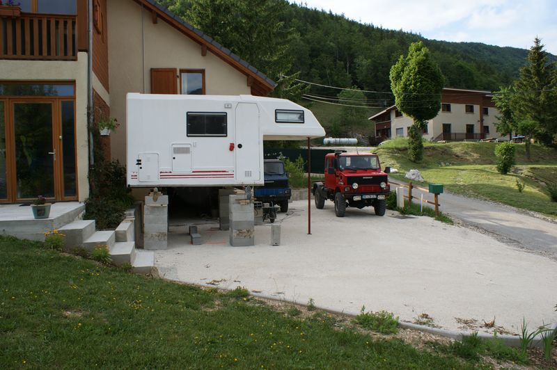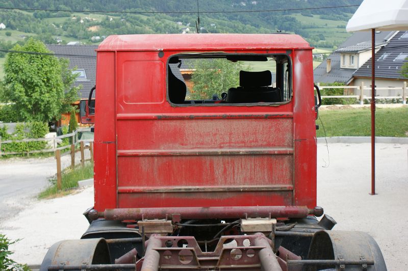 Dépose de la cellule, pour pouvoir installer une baie coulissante sur la cabine du Bremach (il n'y avait pas de fenêtre côté cabine du camion, ce qui faisait une aération certaine dans la cabine en roulant