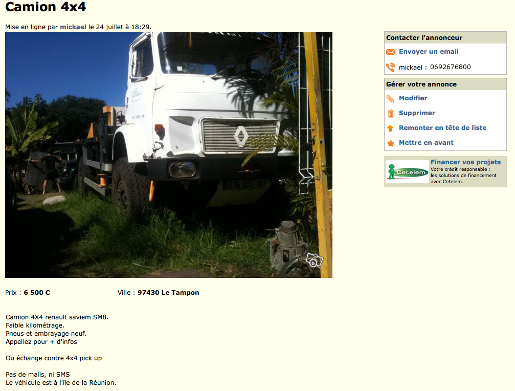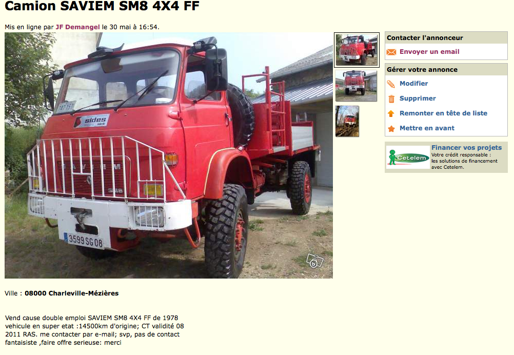 Bon contact avec le vendeur, je cite : <<je possede bien entendu tous les documents qui vont bien car souhaitant l'utiliser sans aucune restriction, il est conforme et passe au contrôle technique chaque année comme n'importe quel autre camion; je fais helas trop peu de km avec et je viens d'acquerir un plus petit vehicule, d'origine militaire cette fois>>