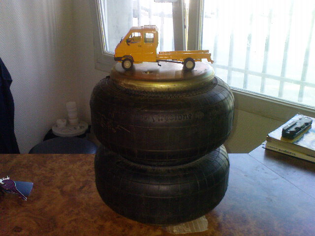 Il faut savoir que le charge supportée est proportionnelle a la pression d'air et au diametre des coussins ,largement surdimentionés dans mon cas ,mais ,chez ,mon fournisseur"gratuit " il n'y avait pas le choix en petit volume ,.....d'autan que ce montage n'est qu'un appoint a la suspension existante.