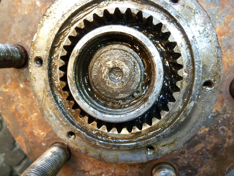 6) maintenant vous pouvez attraper le moyeu dans son ensemble avec le disque de frein et tout faire venir vers vous (attention ça pèse un peu) une partie des roulements conique risque de tomber se n'ai pas grave. retirez un maximum de graisse pour voir à l'intérieur du moyeu car il faudra retirer les parties femelles des roulements coniques. déposer le joint spi coté disque de frein (il faudra bien sur le changer également). Les parties de roulements femelles dépassent légerement de leur appui il suffit de les chasser par l'intérieur du moyeu un fois dans un sens et une fois dans l'autre (car il y a 2 roulements coniques par moyeu)