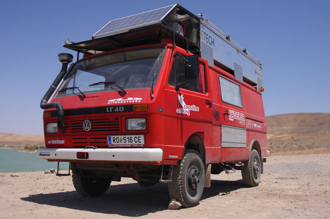 Voilà le LT d'amis à nous autrichiens, il est d'origine pompier et ils ont fait Autriche-Australie avec. On eu vraiment le coup de coeur pour ce camion (ça reste un essence et 80 km/h en vitesse de croisière mais modifié - sièges, taille des roues, etc.- et tout est homologué/certifié en Autriche). Sur le toit, un énorme coffre alu pour le matériel qui sert également de deck et sur lequel on peut poser une tente: