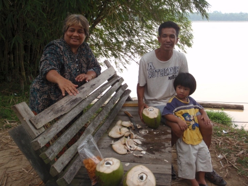 Je veux juste témoigner qu’on a eu une chance extraordinaire dans les environs de Pekan, une zone pas touristique du tout. On s’est pose pour un bivouac en bord de rivière. On a demande a des enfants qui passaient par la avec quoi ils appâtaient pour la pêche, et a partir de la tout s’est enchaine. Les parents sont passe nous voir, nous ont demande de déplacer le fourgon de 100m pour être plus près de leur maison (toujours sur la rivière). Ils nous ont demande combien de temps on pensait rester, 4 nuits. Très bien, et bien venez diner ce soir. Pendant ces 4 jours, une fois leur école finie nos enfants attendaient avec impatience la sortie de classe des enfants de la famille et du coin pour aller se baigner, jouer a foot, faire un tour en scooter… Des gens de passage nous souhaitaient la bienvenue, qui en nous cueillant et ouvrant des noix de coco, qui des beignets, qui des crevettes qu’ils venaient de sortir de la rivière. Nous avons été invite à diner par les uns ou les autres les 4 soirs. Nous étions juste estomaqués. Deux photos pour notre reconnaissance.
