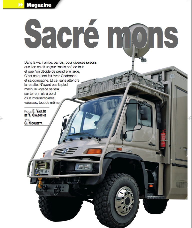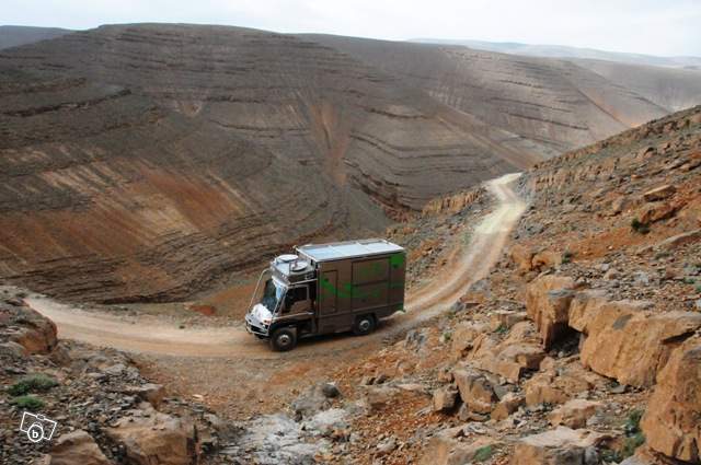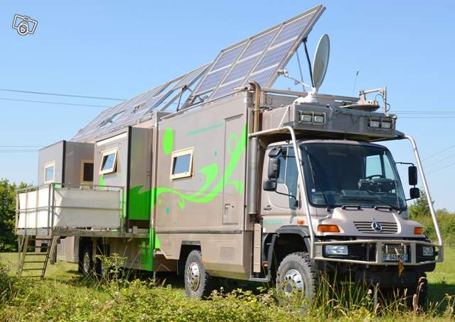 Possibilité de décrocher la remorque et partir avec le porteur Unimog-Mercedes U500, 35.000kms au compteur, pour des randonnées en boucles. Dans ce cas il y a une pièce disponible agrandie par un tiroir comprenant un grand lit relevable laissant découvrir une table, un évier, une plaque électrique/réchaud alcool, un wc, un frigo, un congélateur 4 tiroirs, antenne satellite à tête chercheuse automatique pour l'internet et la télé.