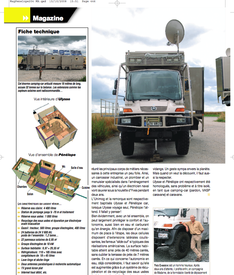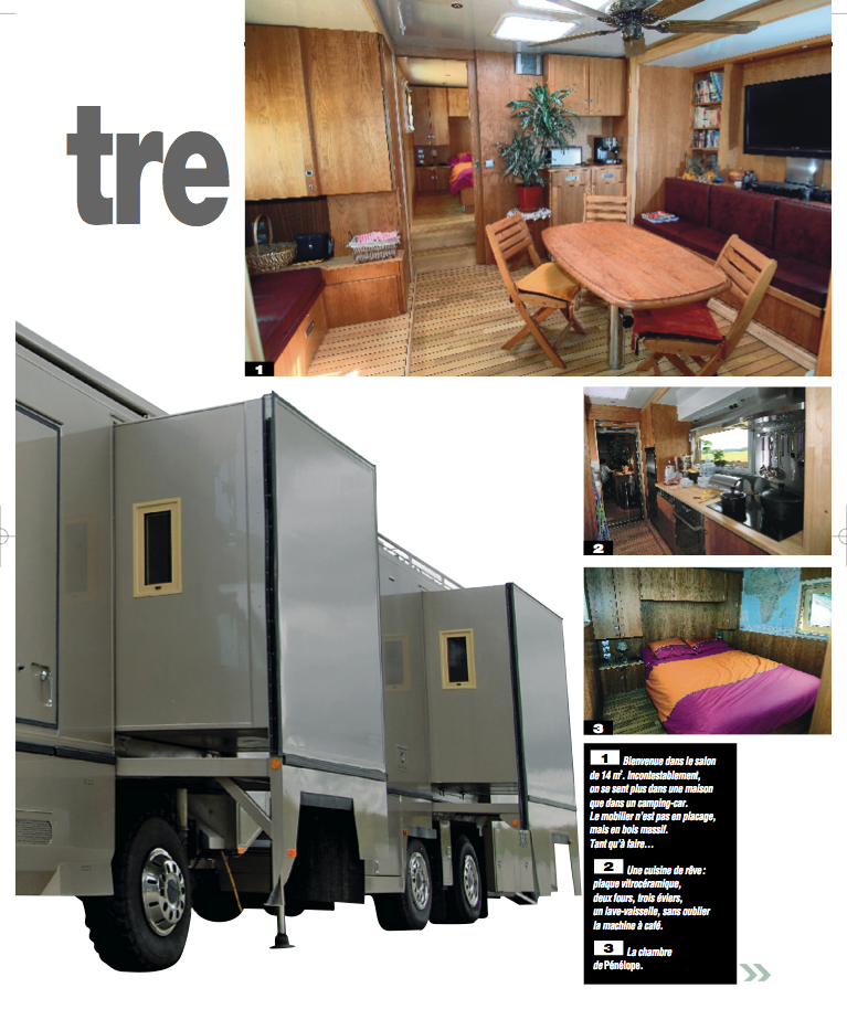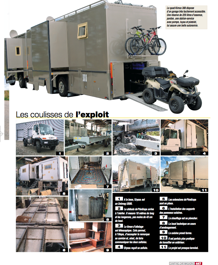 Ensemble routier camping-car, camion 4X4 plus remorque, pour habitation permanente, fabrication réalisée en France; L=18m, l=2,50m, H=4,18m, extensions= 4 tiroirs, photovoltaïques= 22m², réserve d'eau= 4,5m3 avec filtres et ultraviolets pour boisson sécurisée, groupe électrogène Mastervolt 10 KVA, salle de séjour, cuisine, salle d'eau, 2 wc avec stations d'épurations, 2 chambres séparées, garage avec quad neuf embarqué, Yamaha Grizzly 450 4x4.