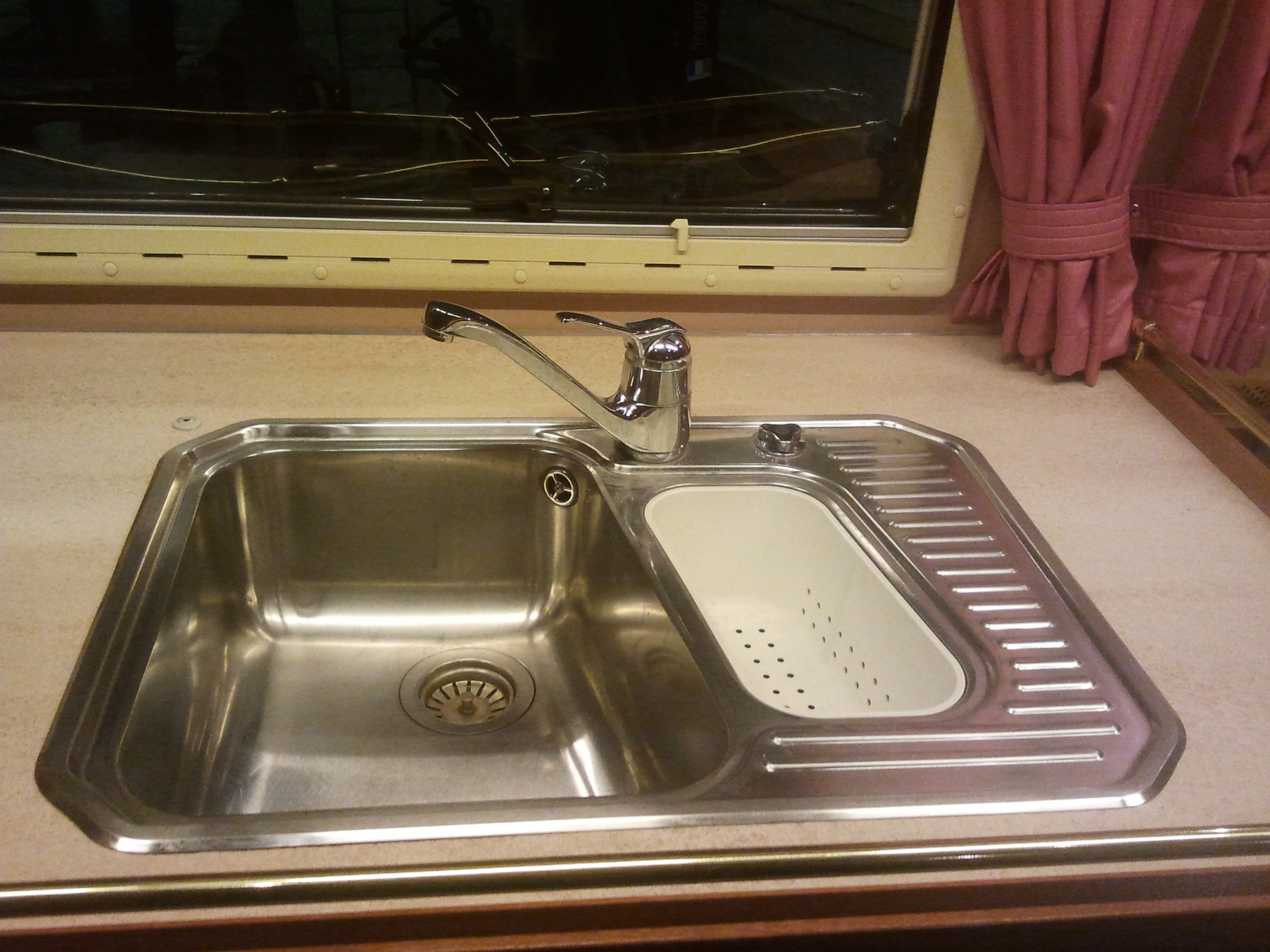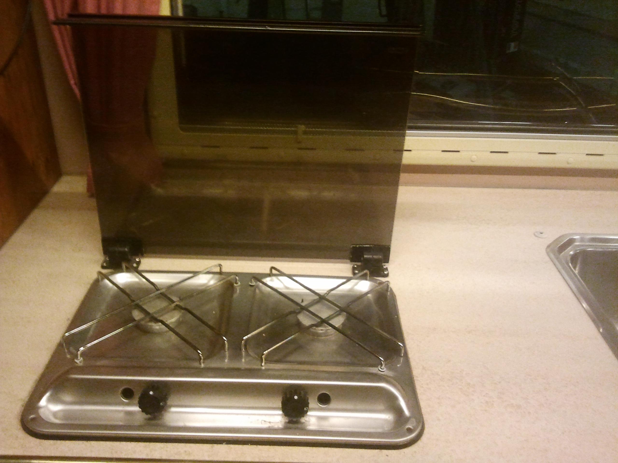 frigo 12v,220v,gaz électrolux, plaques chauffante 2 feu gaz, évier 2 bacs avec robinet et vidange, micro onde.