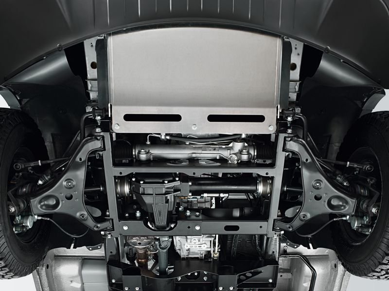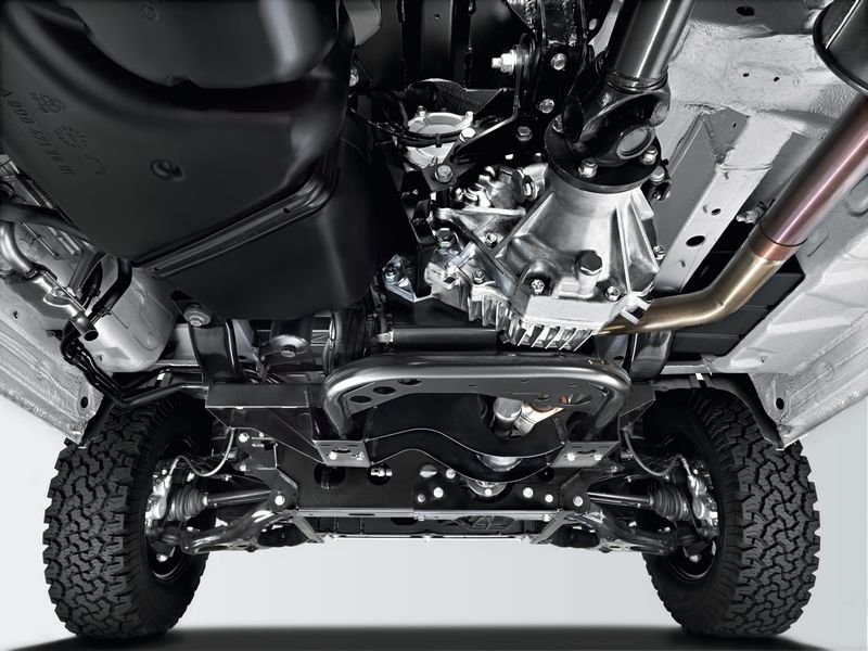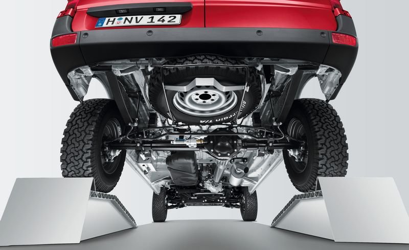 Les modifications effectuées par la société Achleitner au niveau de la suspension avant à roues indépendantes et de l'essieu arrière rigide sont vastes. Les ressorts renforcés avec plus de débattement, les amortisseurs plus fermes à caractéristique progressive et les stabilisateurs modifiés ne sont que les parties manifestes des modifications. Ensemble, ces mesures rehaussent le véhicule d'environ 10 centimètres indépendamment du type de pneus choisis (offroad ou route).