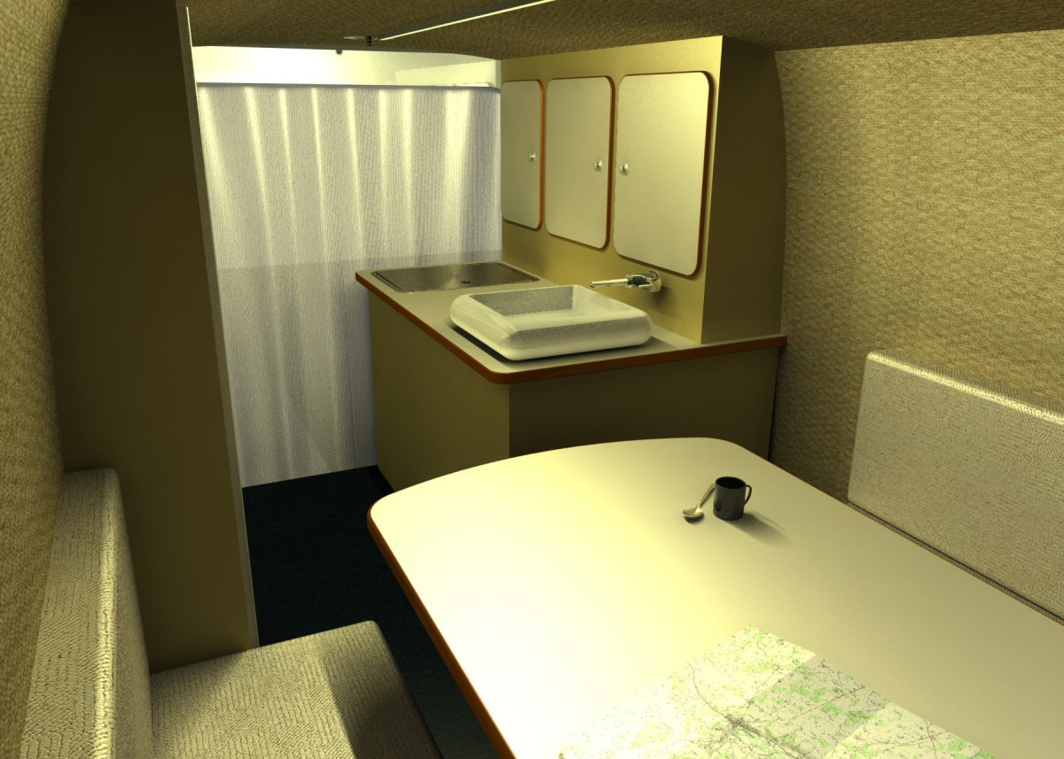 J'ai équipé Pagong de tous les accessoires du bon campeur ! Frigo trimix, chauffage gaz, plaque de cuisson, réservoir d'eau (170 litres), banquette et couchette .
