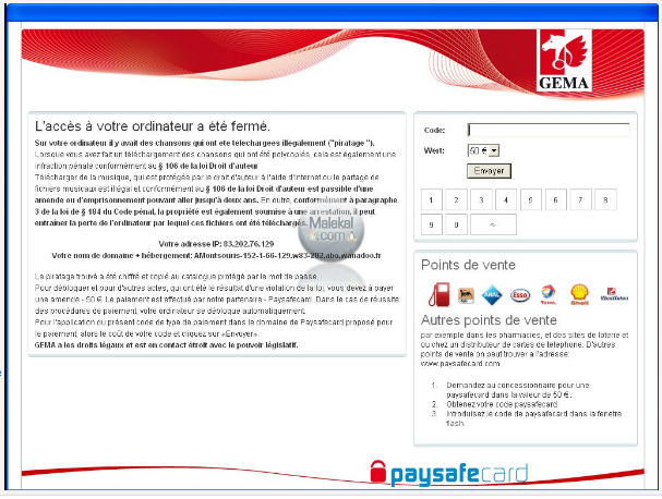 je me suis fait piéger par un virus "GEMA" . ce virus qui porte le nom allemand de l'équivalent de notre SACEM, me bloque mon PC, sous pretexte que j'aurais effectué des téléchargements illégaux.