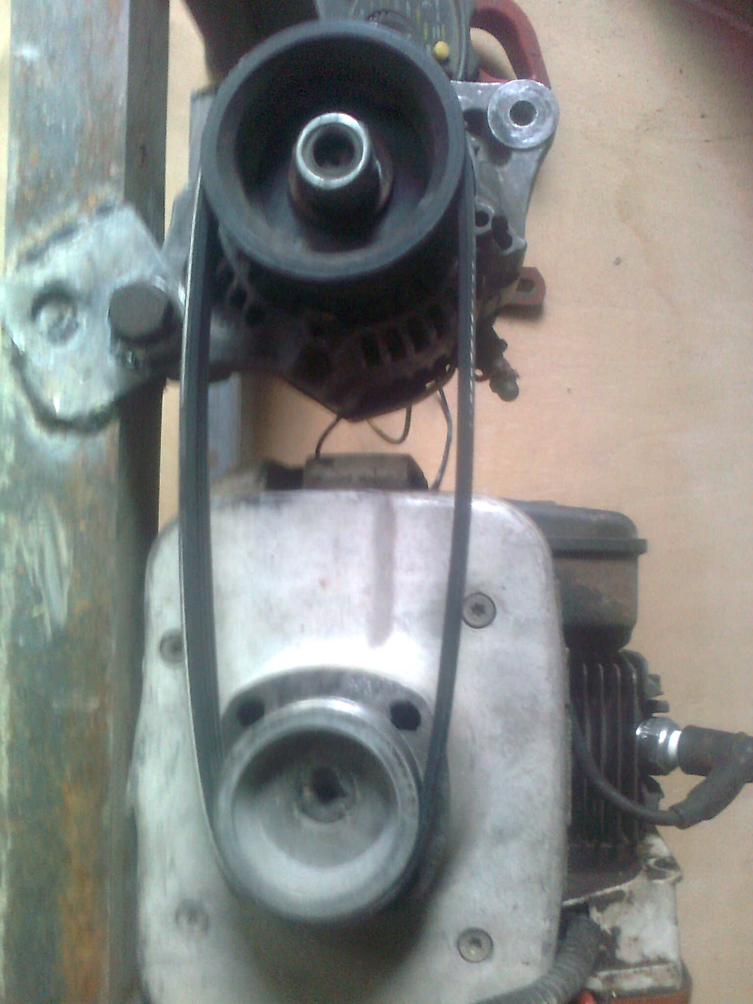 j ai fait un montage avec la poulie sur l alternateur plus grande que sur le moteur , afin de recuperer du couple car ces petits moteur de débroussailleuse n on pas de couple