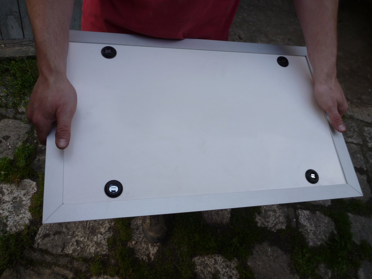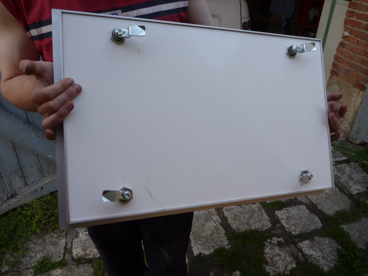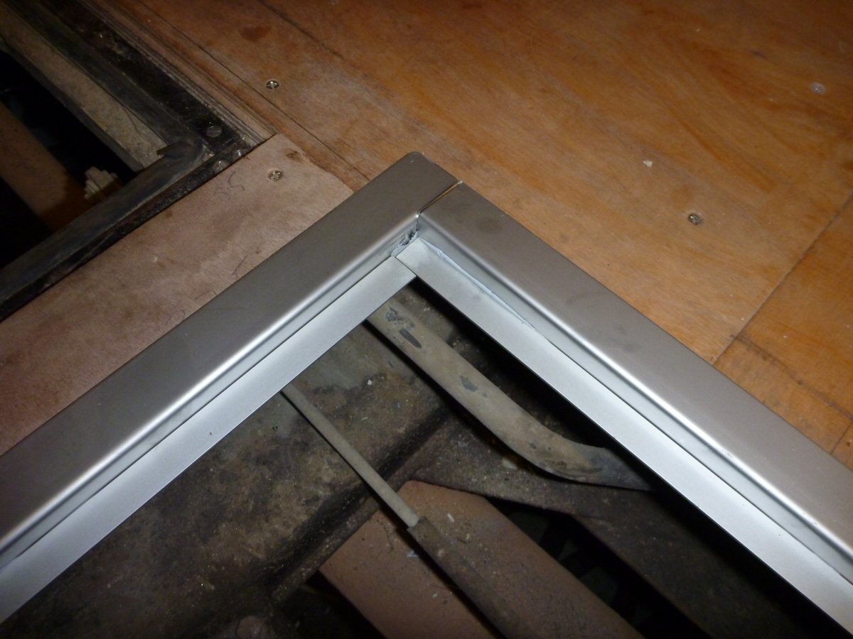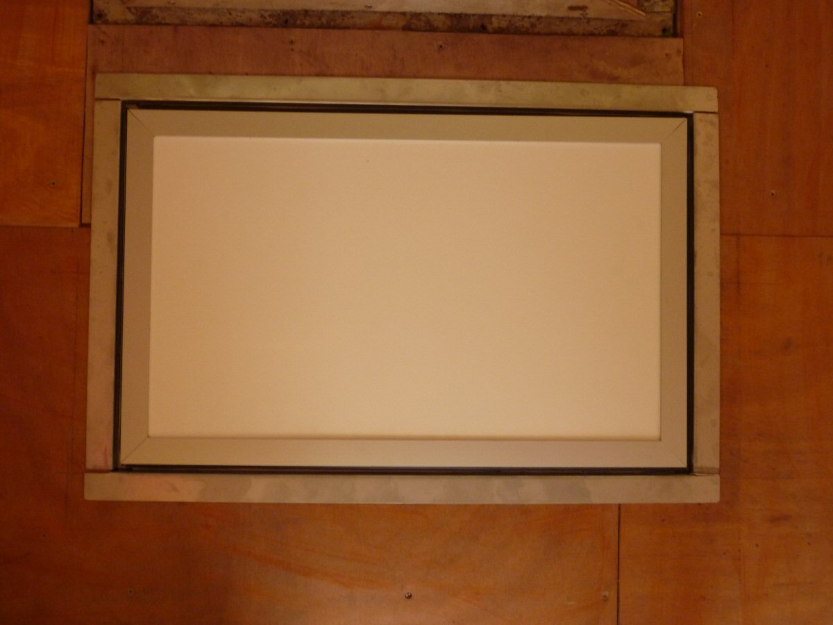 Réalisation de la trappe en contreplaquée de 20mm stratifiée, avec une couche de gel-coat appliquée sur les chants ... Cela permet à la trappe de ne pas craindre l'humidité ... Découpe des profilés aluminium Montage de l'ensemble Présentation du montage Pose des verrouillages par clef carrée Collage d'une plaque de goudron autocollante pour l'isolation phonique ... et ça fait une protection supplémentaire... Voila voila