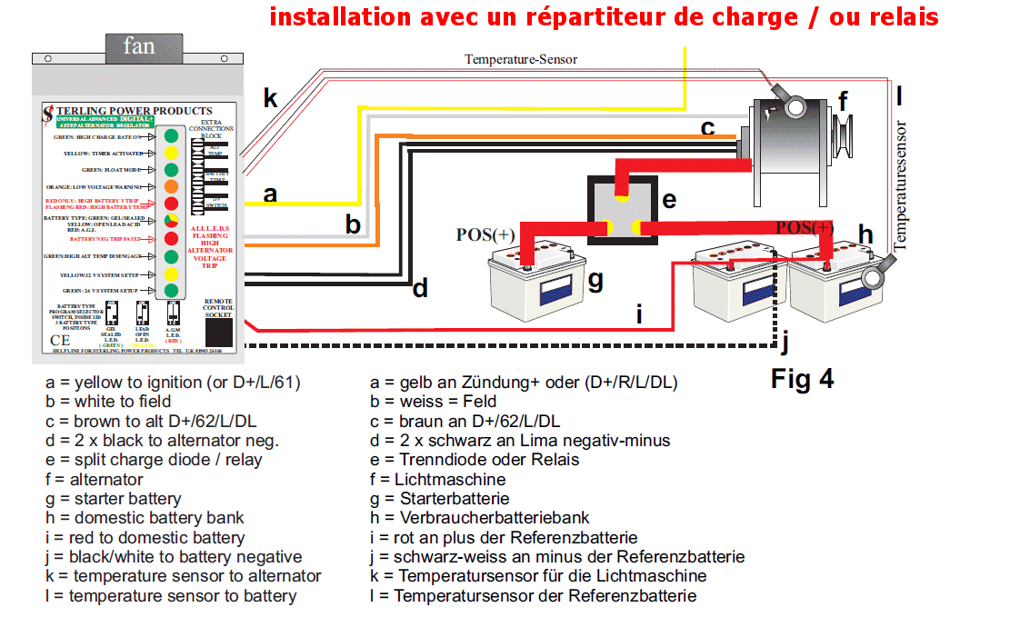 Une broche du coupleur est à relier à l'alternateur (D+) afin de compenser la perte des 0,6V des diodes (l’alternateur débitera 14,5V au lien de 13,9V)