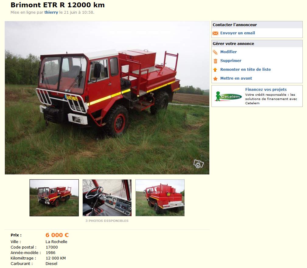 je vend un camion brimont ETR R ,175cv turbo intercooler,ex pompier en citerne mais une tribenne est en cours de montage.il a 12500 km d'origine,absolument pas un point de rouille,super état mécanique,5 pneus neuf a monter.