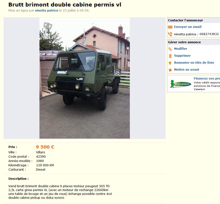 Vend brutt brimont double cabine 6 places moteur peugeot 505 TD 2,5L carte grise permis VL (avec un moteur de rechange 22600km une table de levage et un jeu de roue) échange possible contre 4x4 double cabine pickup ou doka syncro