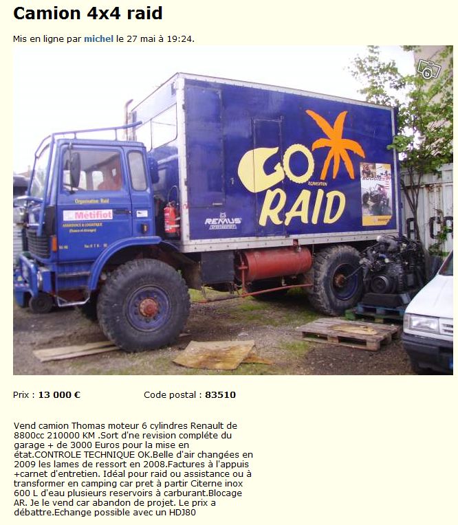 CAMION DE RAID ET D ASSISTANCE de marque Thomas (Moteur Renault) 210 000 Kilomètres d'origine avec carnet entretien depuis le début.