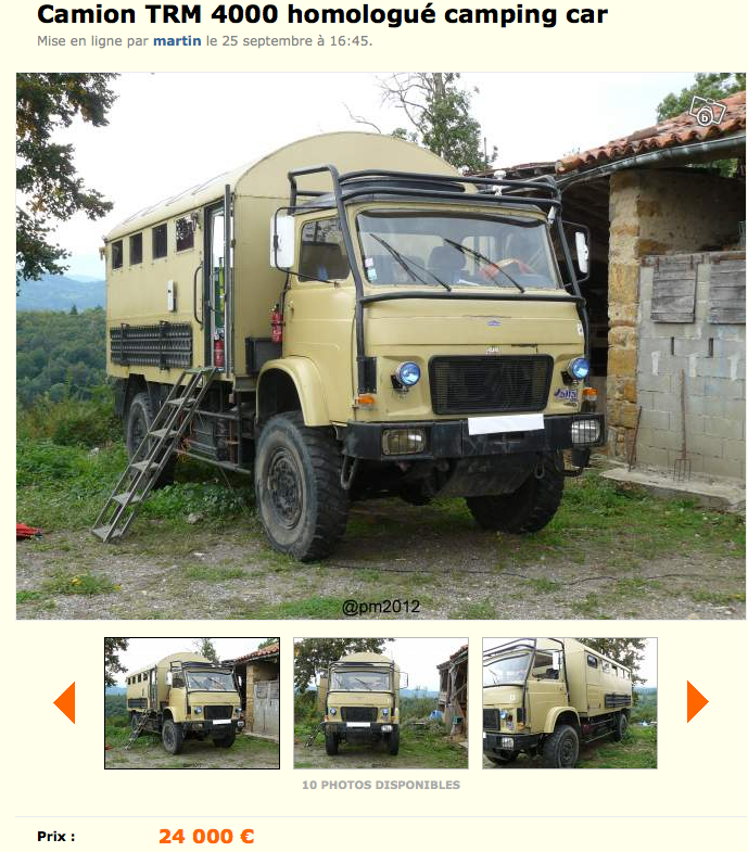 A vendre TRM 4000 homologué camping car pas de limitations ni disque (conduite mention 79 ou C1)très bon état, contrôle technique ok,frigo à compression, pompe eau domestique neuve,chauffe eau neuf,400 litres eau + 300 litres go avec pompe transfert neuve,douche,wc chimique,gps garmin 276c,cb