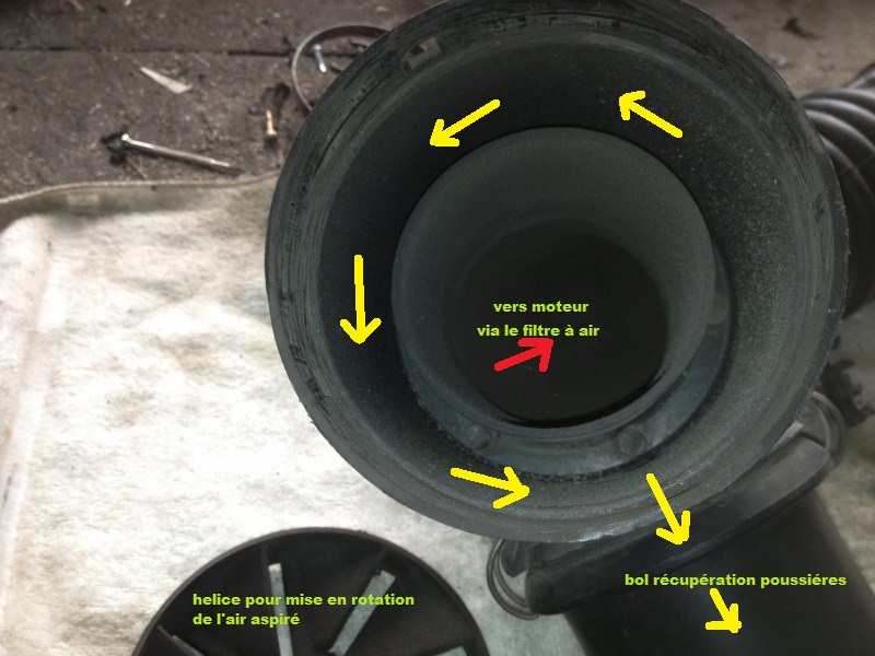 C'est le même principe d'aubes et de cônes pour centrifuger l'air. Il y a deux petits orifices sur le côté pour évacuer la poussière (et un peu d'air avec mais rien ne rentre par là, c'est le principe même du cyclone.