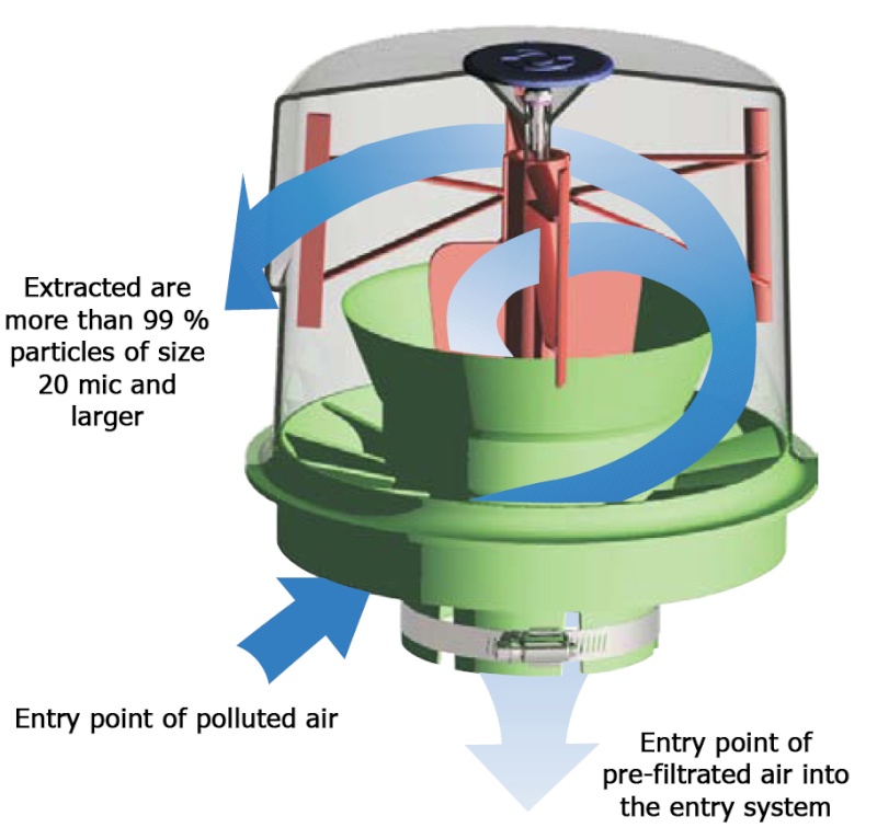 - que faire pour éviter que les impuretés ne reviennent , centrifuger l'air avec un moyen mécanique (aubes) , augmenter la pression de l'air centrifugé pour que sa pression soit supérieure a celle de l’extérieur du pré filtre et ainsi sortir avec ses impuretés.
