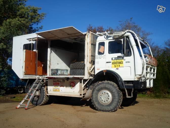 Camion mercedes 4x4 .VASP Atelier.caravanne .Puissance 500 chevaux.V10 , pas de limiteur ni de disque .Roule le dimanche.Gonflage et dégonflage automatique et graissage automatique.8 amortisseurs OLINS.Pneus 1400x20 neufs 10000 km .Réservoir de gasoil 1000 L .3 sieges baquets plus harnais .GPS Teratrip etc.....Arceaux de sécurité.Groupe electrogène,treuil électrique monté sur bras articulé.Palant.Nombreuses pièces de rechange mécanique.Pour ce qui concerne l'espace vie: douche avec eau chaude,frigo,plaque de gaz avec évier,couchage 2 possibilité 4.Placards de rangement,panneau solaire,350L d'eau.Véhicule idéal pour assistance raid ou balades.Véhicule très puissant et très confortable et surtout très fiable.Véhicule préparé chez Mercedes en Allemagne.Pour plus de renseignement merci de teléphoner.