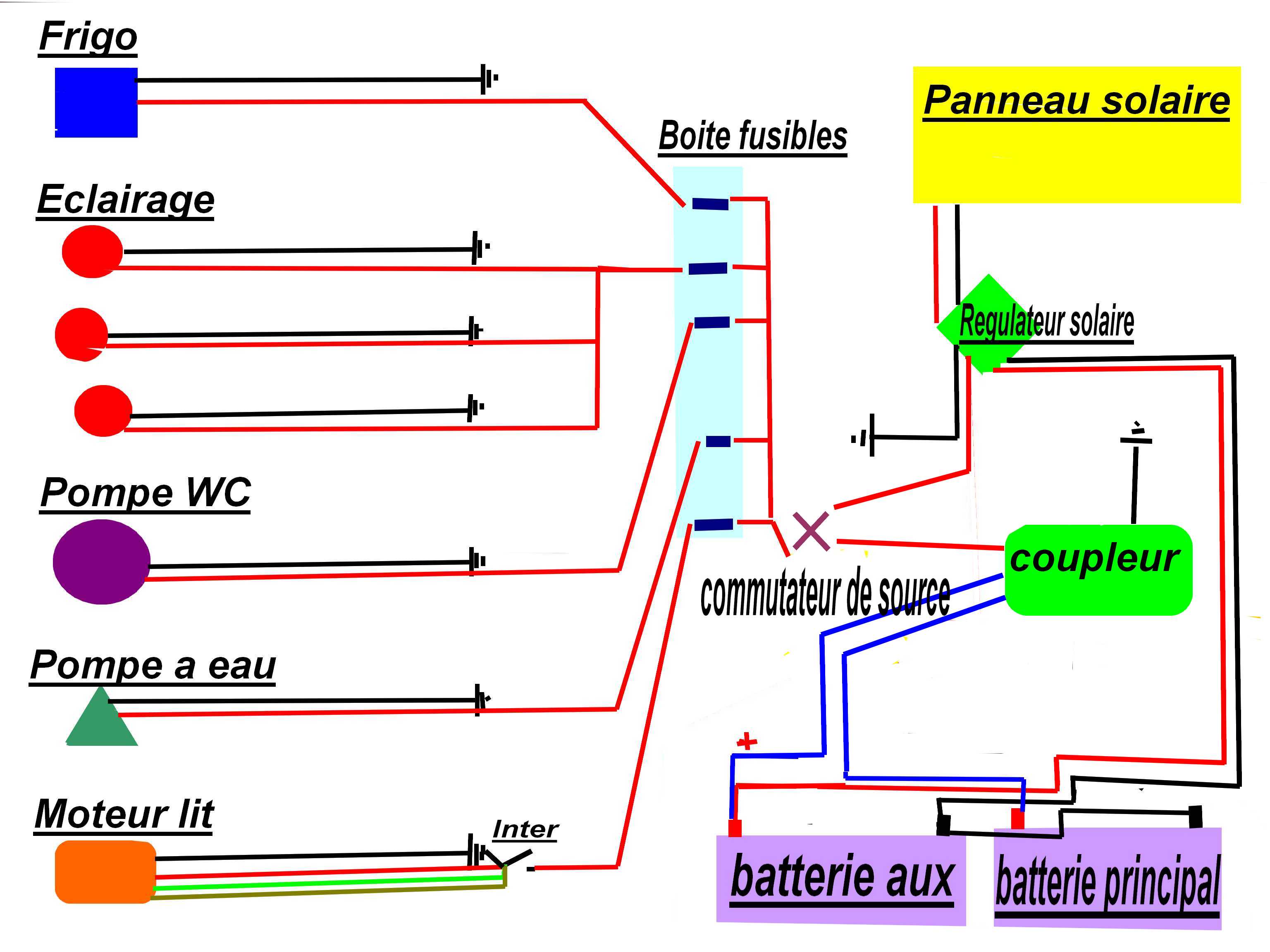 New-one je réchauffe ce post car je réfléchis à mon système électrique et ta façon de voir les choses me convient et me correspond. Je vais donc partir sur ces bases là pour réfléchir mon système. Deux batteries de démarrages en 12v et deux batteries identiques en servitude; Bien sûr je vais faire attention au câblage comme dit dans un autre post et utiliser un commutateur 3 positions pour orienter ma production et consommation de courant. Sur les batteries de démarrage c'est l'alternateur qui bosse et sur les autres ce sera des panneaux solaires surdimensionnés. c'est là que j'ai besoins de précisions. Comment les panneaux solaires peuvent -ils charger les batteries de démarrage et vice versa? peux tu expliquer ce cablage?