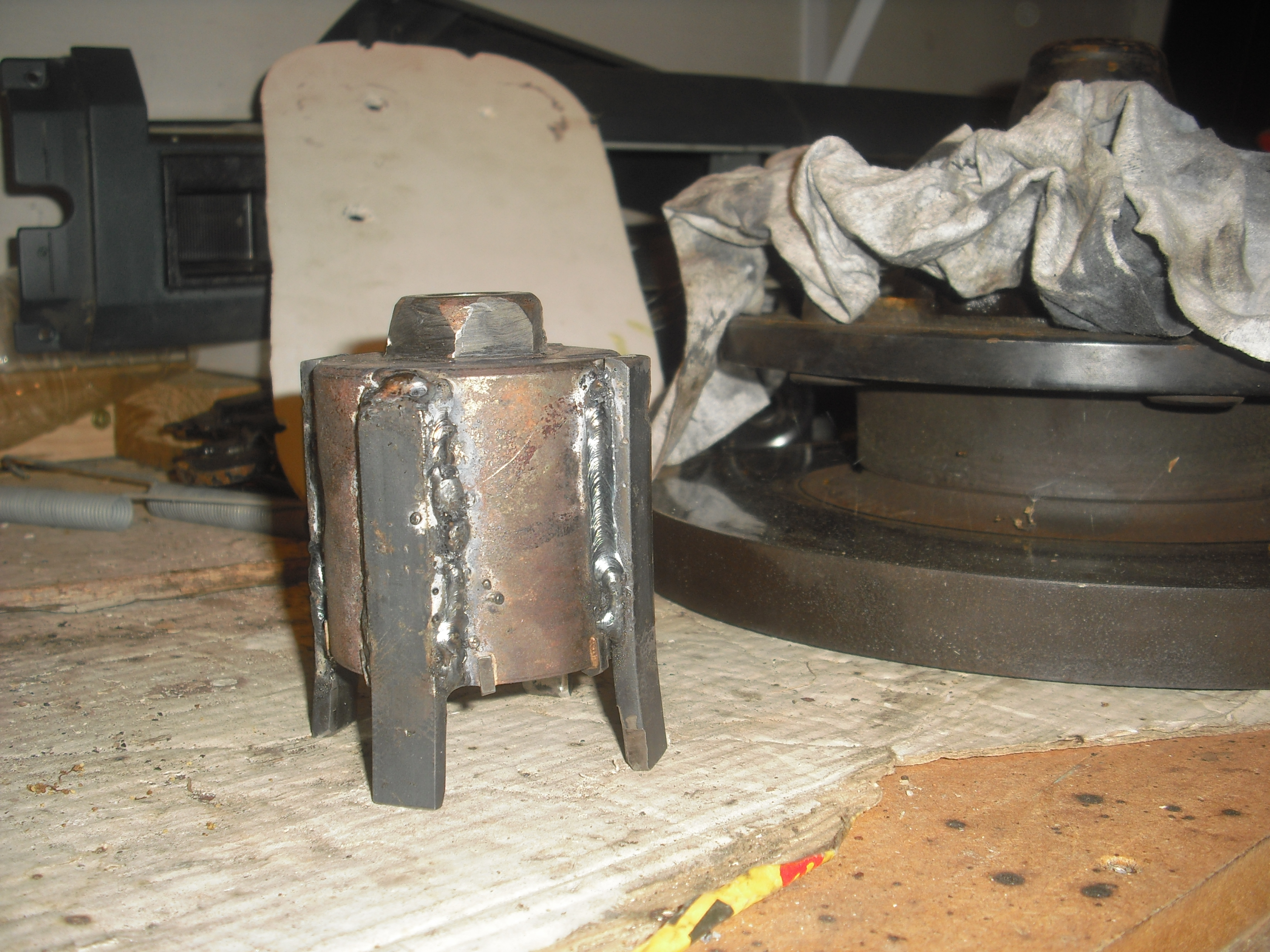 mais je viens de verifier avec ce qui traine dans mon garage et une scie cloche à materiaux pourrait servir de support sur lequel on viendrait souder des pates pour faire les ergots. je pense que ça peut être solide.