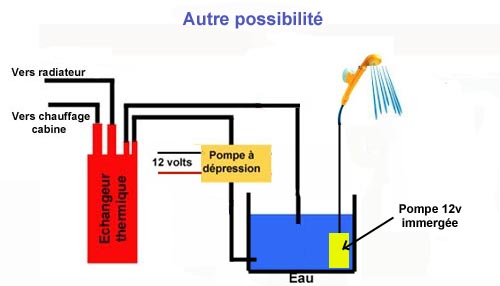 Pour ce qui est d'installer une pompe pour la circulation de l'antigel du radiateur c'est autre chose....Je préfèrerai sans doute mettre un bidon d'une contenance supérieure. Pour bien se doucher avec lavage des cheveux, il faut environ 7L/personne....il y a des jerricans en plastique pour le gasoil qui font 30L, c'est peut-être une solution pour "sebidon"
