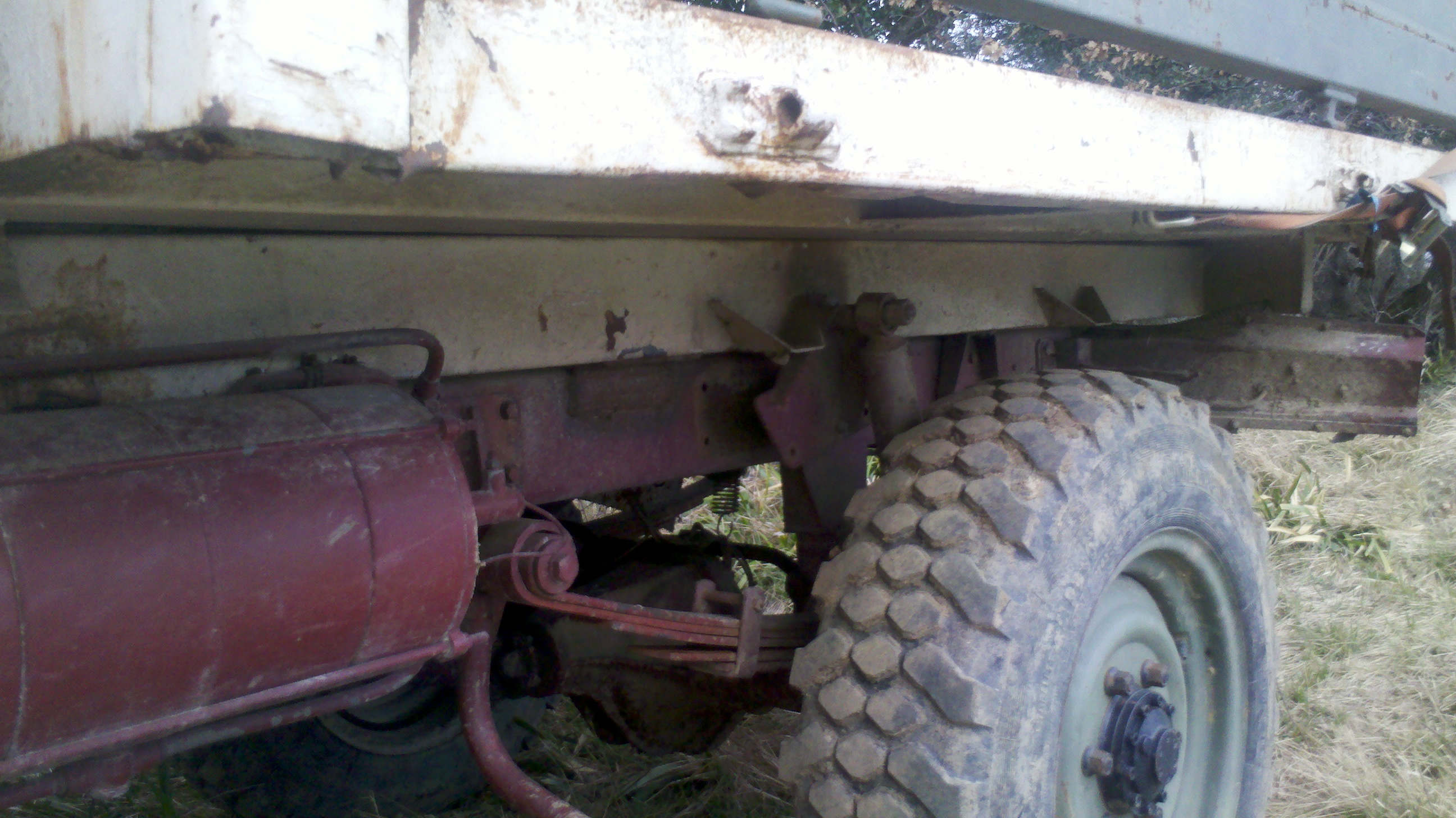 si si vous ne rêvez pas, je ne suis pas non plus david copperfield, ce n'est pas une illusion d'optique, le faux-châssis de la benne basculante est plus large que le châssis du brutt, qu'a cela ne tienne, admirez les soudures-collage. Le plus "drôle" c'est le support d'amortisseur, lui aussi soudé au faux-châssis, mais avec un restant de baguette dirait on...et alors la bride d'amortisseur au dessus de lame, ...