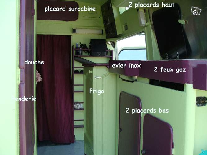 - Réfrigérateur 12 et 220V (consomme un peu trop d’électricité et mériterait d’être modifié pour une glacière moderne 12V d’où gain de place. Peut être démonté avant la vente si nécessaire)