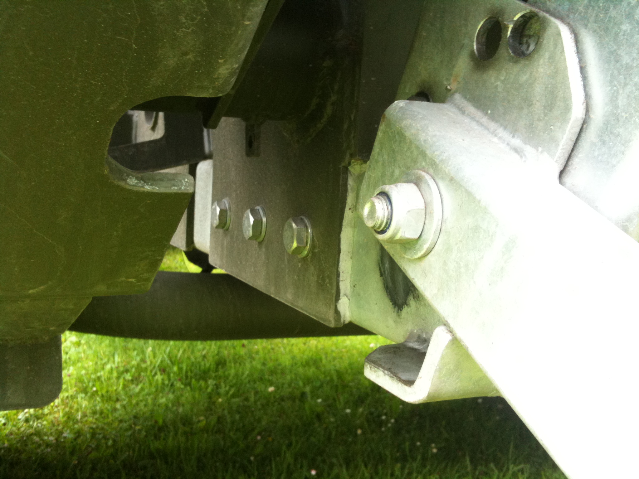 Entre les 2 montants en tube carré une plaque est soudée, sur laquelle sont soudés 2 gros écrous dans lesquels je mets 2 goujons qui servent à maintenir la roue.