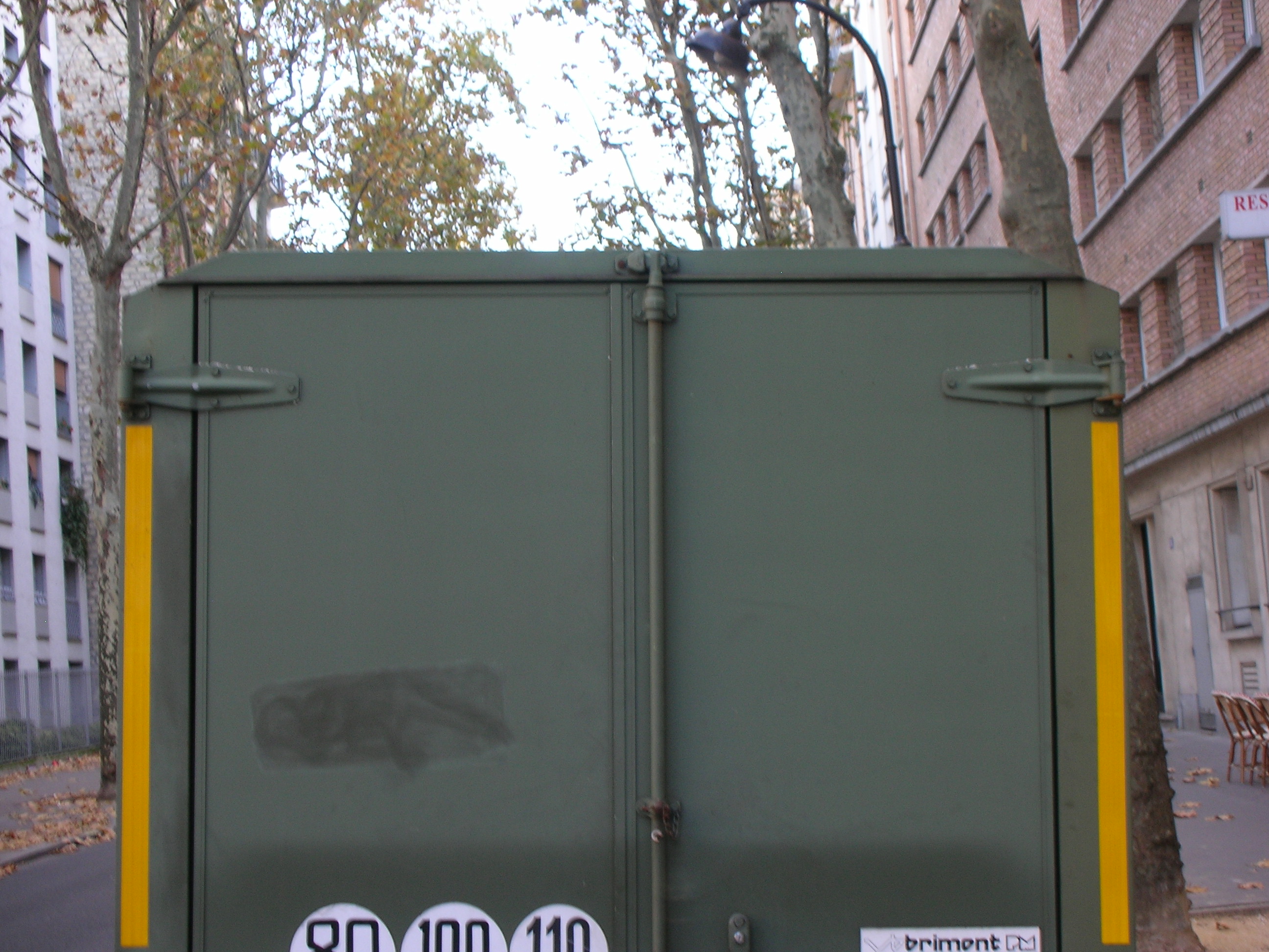 en fait je ne sais pas, il y a deux grosses marches qui font la largeur qui se replient contre les portes arrières, les bords du toit sont en biais et il y a une fenêtre sur le coté droit (le gauche n'était pas visible et l'arrière je ne me rappelle plus